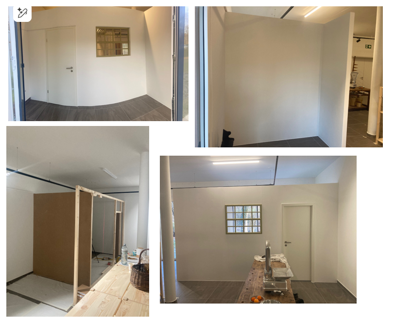 Fourniture et pose d'une cloison de bureau, ossature bois, rénovation d'une ancienne fenêtre, pose de porte, joint silicone, pose d'une prise électrique.