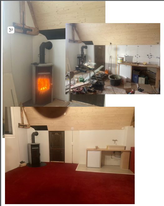 Isolation d'une grange depuis l'intérieur 140cm, pose d'un lambris 3pli, pose d'une porte, installation d'un poêle à bois, carrelage, plan de travail cuisine, installations sanitaires et électriques.
